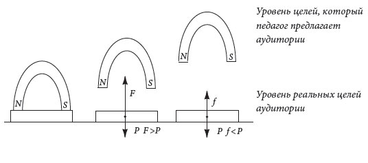 Если уровень магнита не выше уровня пластины, то пластина не поднимется: магнит не тянет ее кверху а сам мешает ей подняться. Если уровень магнита несколько выше уровня пластины, так что сила притяжения к магниту (F) больше, чем притяжение Земли (Р), прижимающее пластину к столу, пластина поднимется к магниту. Но если магнит расположен намного выше пластины, так что сила притяжения к магниту (f) меньше, чем сила земного тяготения (P), то пластина не поднимется, а останется на прежнем уровне. В этой модели уровень пластины – аналог уровня актуальных, реальных целей аудитории (учащихся). А уровень магнита – целей, которые лектор (педагог) ставит перед учащимися.