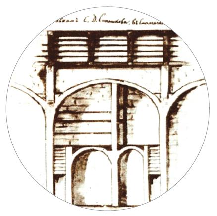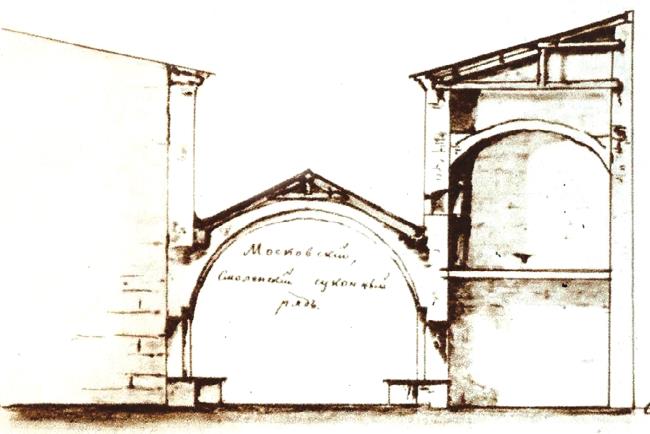Каменные лавки Суконного ряда в конце XVIII в.: между двухэтажными корпусами проходит перекрытая сводом торговая улица
