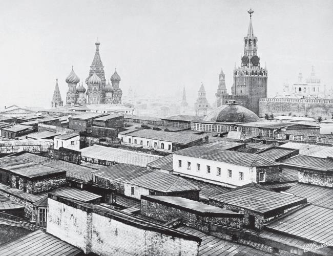 Торг на месте нынешней Красной площади документально известен с 1434 года, но, вероятно, он существовал здесь, у Фроловских ворот Кремля, уже в XIV веке. После пожара 1594-го царь Федор Иоаннович распорядился о строительстве первых каменных лавок Торга, однако, по всей вероятности, стройка была реализована Борисом Годуновым к 1599 году. Ряды представляли собой огромный комплекс, протянувшийся от Никольской улицы до Водяных ворот. Фактически, они были отдельным городом с перекрещивающимися улицами, перекрытыми каменными сводами с окошками для света и оснащенными глубокими сводчатыми кладовыми. Они несколько раз перестраивались, но были окончательно снесены лишь в конце XIX века. Нынешний ГУМ (1893) унаследовал от них схему устройства – перпендикулярные линии-улицы (девять против пятнадцати прежних) и прозрачные своды над ними. Топография комплекса подробно разобрана С. К. Богоявленским[8], однако объем изначального годуновского строительства в рядах неизвестен. Попробуем уточнить порядок поэтапного возведения каменных лавок, приходивших на смену деревянным шалашам и навесам.