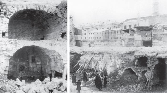 В процессе работ были раскрыты шесть помещений, четыре из которых запечатлены на фотографиях, сделанных членами Археологического общества. В описании сказано: «Некоторые из них глухие, без дверей, но имеющие небольшие полукруглые окна, через которые можно видеть соседние камеры, другие имеют между собой коридорное сообщение»[20]. На фотографиях видно, что устройство камер было близко к схеме, представленной на упомянутых выше чертежах: высокий коридор, разрыв в кладке свода которого, возможно, является световым окном, и двухъярусные лавки подле него. Верхняя комната сложена из кирпича, нижняя – из белого камня, одна из комнат имеет дверь и маленькое зарешеченное окно, возможно, смотревшее в проход Суконного ряда. Скорее всего, это была одна из построек, возведенных внутри комплекса в XVII столетии.