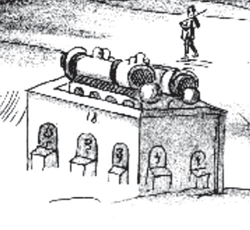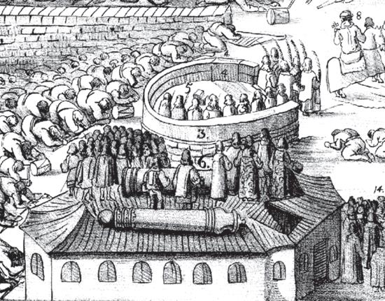 В 1636 году «Сретенской сотни тяглецом» Ивашкой Тюкой был сооружен каменный Спасский раскат вместо деревянного, стоявшего позади Лобного места. Под государевыми пушками он сделал «погреб каменный да кладовую полату длиною на 10, поперег на 8 саженях, да круг сторон погреба и полаты 22 лавки каменных»[23]. На кровле-трибуне этой необычной постройки до начала XVIII века стояла 40-тонная Царь-пушка, а не позже 1720-х годов в погребе прописался знаменитый в Москве кабак «Под пушкою», он же «Негасимая свеча»[24]. На гравюре Мейерберга здание изображено с рядом арочных проемов в лавках[25] и со входом на прямую широкую лестницу, ведущую на смотровую площадку. Вероятно, дверь в подклет находилась с противоположной стороны здания.
