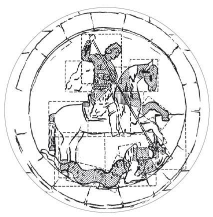 Реконструкция каменной скульптуры св. Георгия над проездной аркой Фроловских (Спасских) ворот, 1464. По материалам О. В. Яхонта.