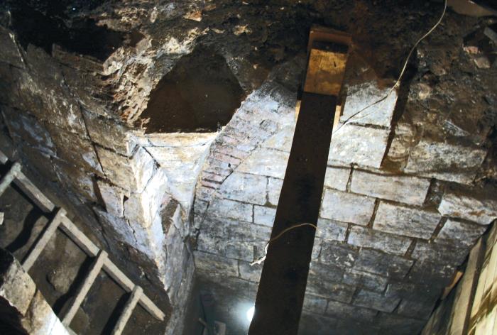 Подклет церкви св. Варвары 1514 г., раскопанный под существующим зданием в 2006 г. Слева и справа видны откосы высоко расположенных оконных проемов, меж ними – основание свода