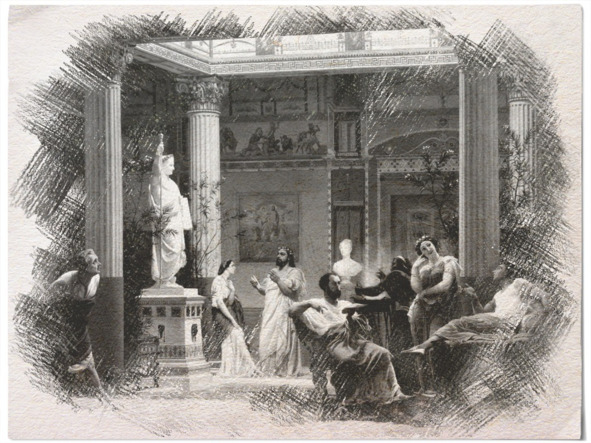 В саду имения было пустынно. «Наверно, все в доме, отдыхают от полуденной жары» – подумала я. Хотя в коридоре из колонн, куда я зашла, было терпимо, потому что арочные своды прикрывал от солнца тент. Мимо, не обращая на меня внимания, пробежал мальчик-раб с амфорой. Я осторожно двинулась по коридору к жилым помещениям, разглядывая стоящие повсюду статуи. Мне повезло – наша путешественница находилась в глубине ближайшей комнаты. Юная красивая девушка сидела перед большим серебряным зеркалом и укладывала роскошные чёрные волосы в замысловатую причёску, напевая что-то себе под нос. Заколов последнюю шпильку и удовлетворённо улыбнувшись своему отражению, она подхватила со скамьи оранжевое покрывало, повернулась к входу и испуганно ахнула при виде меня, неподвижной, как изваяние.