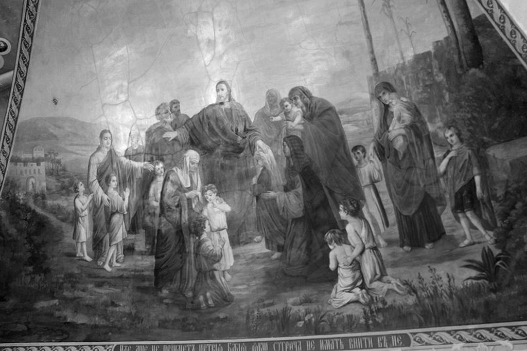 В результате через неделю работ очистилась фреска размером около 100 квадратных метров высокой сохранности – процентов на 95. По словам отца Иова, в Вятском крае это единственная старинная роспись такой сохранности на большой площади. По сюжету на основной фреске, Иисус Христос встречается с народом Израиля и ведет проповедь, а люди внимательно Его слушают. По лицам видно, что кто-то Ему не верит. А дети не понимают – у них свои жесты. С левой стороны – поселение израильтян. Мелким масштабом прописаны пальмы, на заднем плане играют дети, мать с ребенком стоит в воротах, она не пошла на встречу со Спасителем. Очень интересная работа.