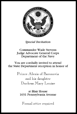 The parlor of Blair House across the street from the White House and currently the temporary residence of Prince Alexis of Baronovia, and his daughter, the duchess Mary Louise, was ablaze with lights. The buzz of conversation almost drowned out the soft music played by a quintet of uniformed U.S. Marine musicians. The air was filled with the appetizing scent of hors d’oeuvres being offered by white-gloved waiters. Foreign notables from countries around Europe were easily identified by the multitude of colorful ribbons and medals on their chests. United States diplomats were equally distinguishable by their conservative tuxedoes. Wade’s experienced gaze didn’t miss the men in suits, CIA and FBI operatives, who attempted to fade into the woodwork.
