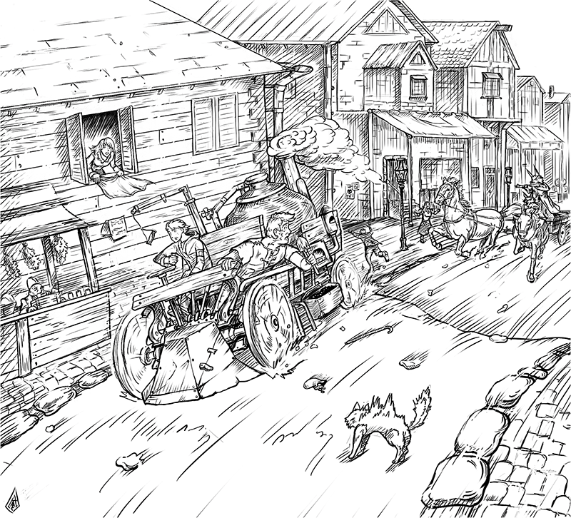 Атлас скинул полотно. Взору Грима предстала невероятная по своему виду машина, внешне напоминающая повозку с огромным количеством рычагов, а также трубой и котлом, встроенными в заднюю часть экипажа.