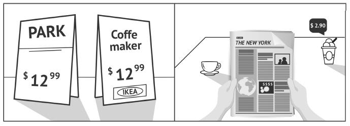 Не обязательно сравнивать свое предложение с аналогами прямых конкурентов. Пара примеров от Жива Кармона: IKEA сопоставляет стоимость кофемашины и стоимость парковки; New York Times, будучи одной из самых дорогих газет, сравнивает стоимость номера с мороженым.