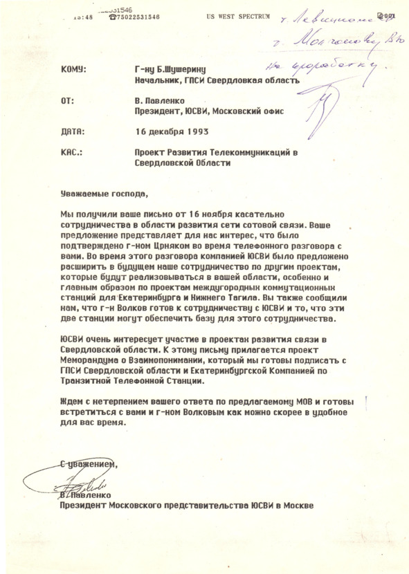 16 ноября 1993 года Б.Ф.Шушерин направил письмо Президенту Московского представительства US WEST International (USWI), крупнейшей американской компании сотовой связи. К тому времени, как я уже упоминал, USWI выиграла конкурс на получение лицензии на построение сетей сотовой связи стандарта GSM в ряде регионов России, в том числе Ростовской и Нижегородской областях.