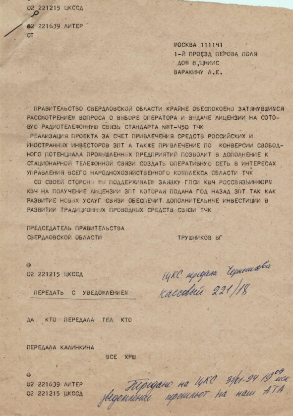 Время шло, а подведение итогов конкурса на лицензию NMT-450 постоянно откладывалось. В конце января по просьбе Б.Ф.Шушерина была направлена телеграмма от председателя Правительства Свердловской области В.Г.Трушникова на имя председателя конкурсной комиссии генерального директора ЦНИИС Л.Е.Варакина, в которой высказывалась обеспокоенность Правительства Свердловской области «затянувшимся рассмотрением вопроса о выборе оператора и выдаче лицензии на сотовую связь NMT-450». Особо было отмечено, что Правительство области поддерживает Заявку ГПСИ «Россвязьинформ» на получение Лицензии. Поддержка местных органов власти высоко оценивалась в Минсвязи и могла сыграть решающую роль в решении конкурсной комиссии.