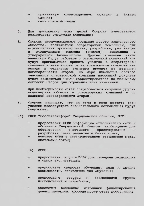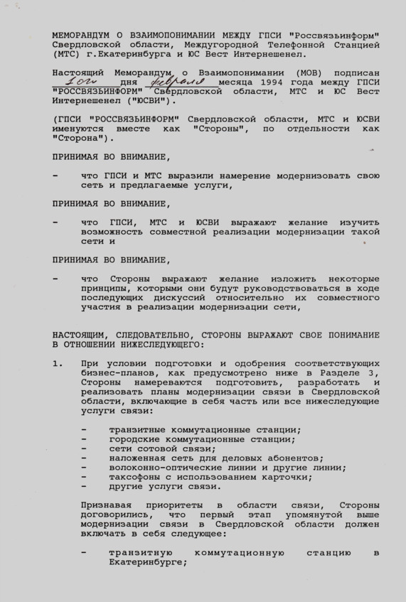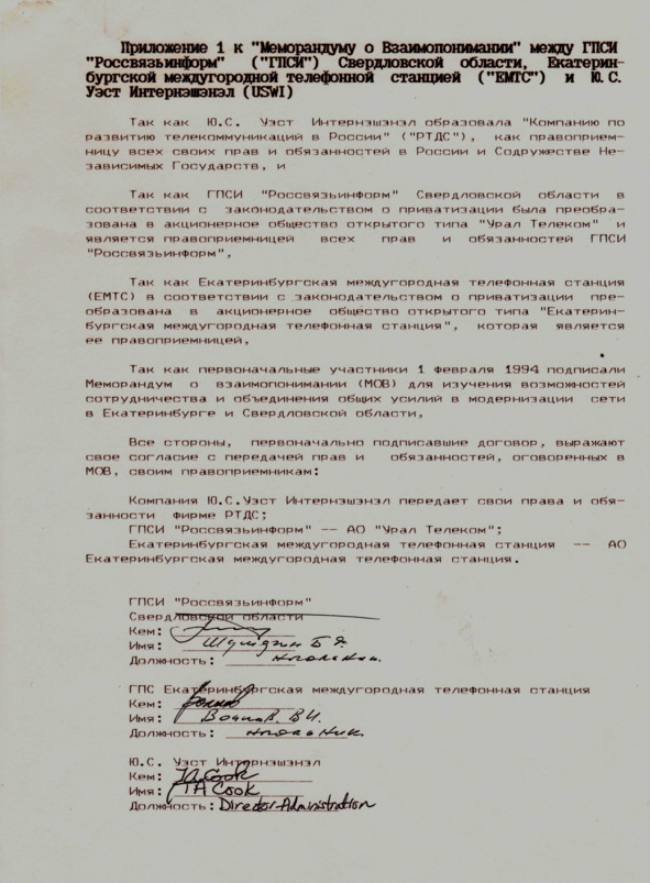 2 марта в Екатеринбурге состоялось совещание представителей АООТ «Уралтелеком» Свердловской области, АООТ Екатеринбургская МТС и РТДК. АООТ «Уралтелеком» представлял генеральный директор Б.Ф.Шушерин, первый заместитель генерального директора С.В.Левицкий и я как руководитель группы инвестиций и развития. АООТ «Екатеринбургская МТС» представлял генеральный директор В.И.Волков. От РТДК в Екатеринбург приехали директор по маркетингу Марьян Црняк, финансовый директор Реймунд Хо и переводчик Константин Польсков. По результатам двух дней непрерывных совещаний был подписан протокол, в котором были зафиксированы следующие решения: