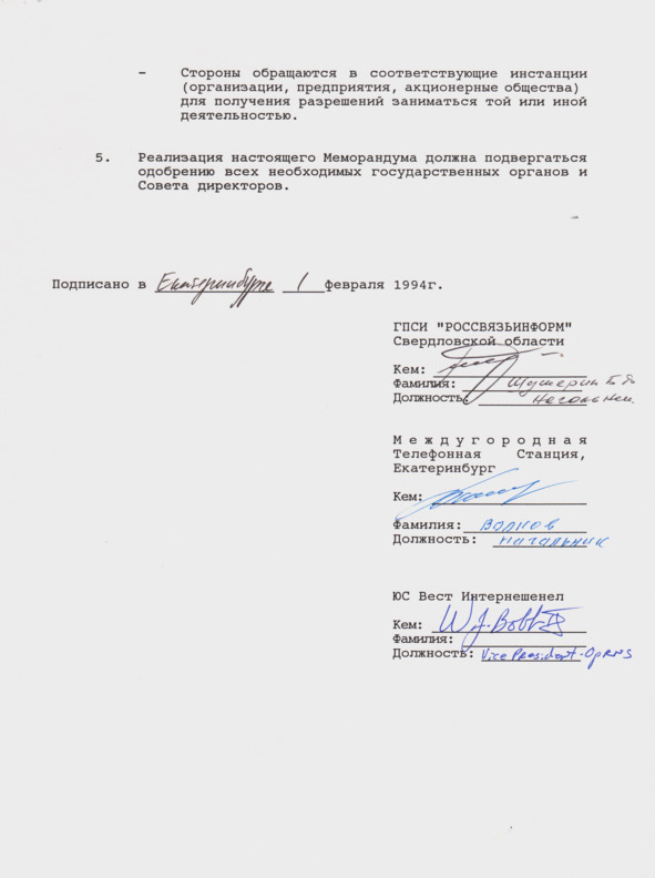 С российской стороны: Генеральный директор АООТ «Уралтелеком» Свердловской области Борис Федорович Шушерин, Генеральный директор АООТ «Екатеринбургская МТС» Валентин Иванович Волков и я, как эксперт и кандидат на должность генерального директора АОЗТ «Уралвестком».