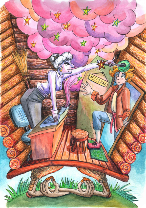 Ваня вылез из машины,Попинал ногою шины,Дунул, плюнул, окрестился —И вперёд пешком пустился.Вышел Ваня на опушку,Видит он: стоит избушка —На куриных на ногах,С крупной вывеской«ЛесСтрах».Заглянул Иван в избушку —За столом сидит старушка:– Повезло тебе, Ванюша,Что нашел меня. Ну, слушай:Та девица – не синица,А скорее как жар-птица.Хоть живет недалеко —А добраться нелегко.
