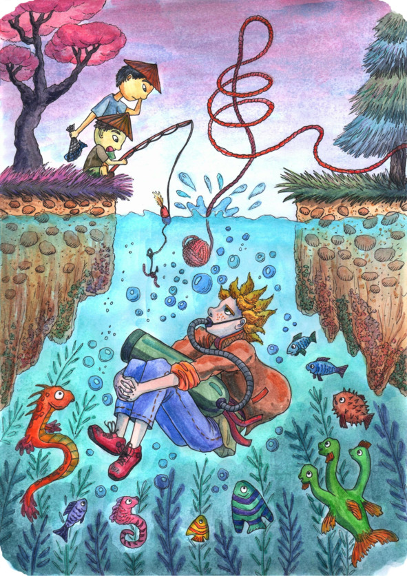 Пропищал клубок: – Граница!Нам тут надо распроститься! —Прыгнул в воду и растаял,Ваню одного оставил.