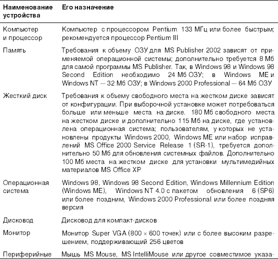 Для работы MS Publisher 2002 рекомендуется использовать компьютер, работающий под управлением операционной системы Windows 2000 Professional, имеющий 128 Мб ОЗУ и оснащенный процессором Pentium III. В табл. 1.2 перечислены минимальные требования к компьютеру, предъявляемые программой MS Publisher 2002.