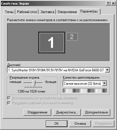 Качество цветопередачи (Color Resolution), называемое также «глубина цвета», устанавливает максимально возможное количество цветов, одновременно отображаемых на экране камерой. Цветопередача есть у всех устройств, передающих цвет, – принтера, сканера, монитора. Для того чтобы увидеть эту характеристику, например, для монитора, необходимо щелкнуть на рабочем столе правой кнопкой мыши и выполнить команду: Свойства | Параметры (рис. 1.2).