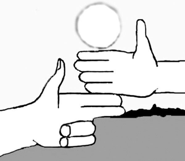 Время до захода Солнца можно определить, выставив в сторону Солнца раскрытую ладонь на расстояние 50 см от глаз и посчитав количество пальцев, закрывающее промежуток между светилом и горизонтом из расчета, что один палец соответствует примерно 10 минутам движения Солнца по небосводу (рисунок 1.1).
