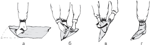 Носки могут заменить портянки, которые делаются из куска материи шириной 20–30 см и длиной 45–60 см. Прежде чем обертывать ногу портянкой, необходимо помять ее в руках, затем расстелить на ровном месте и поставить на нее ногу близ одного края. Взять правой рукой передний угол короткого конца портянки и обернуть им стопу сверху, подсунув уголок портянки под ногу (рисунок 2.4 а). После этого натянуть длинный конец портянки одной рукой, передать ее в другую руку и обернуть ногу, тщательно расправляя складки на подъеме стопы и на подошве (рисунок 2.4 б). Обернув стопу, подошву и пятку, натянуть свободный конец портянки вверх вдоль голени (рисунок 2.4 в). Потом задним концом портянки обернуть голени (рисунок 2.4 г).