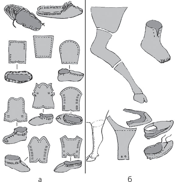 Обувь из кожи не трудно сделать по одной из выкроек, приведенных на рисунке 2.7 а. Или изготовить из голеностопного сустава крупного копытного животного (рисунок 2.7 б).