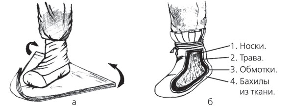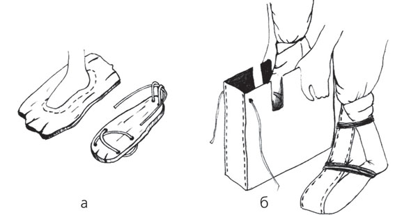 Из куска коры можно сшить пару сандалий. Для этого нога ставится на кусок кожи и по всему периметру ступни вырезается подошва с припуском в 1 см (рисунок 2.6 а). По периметру выкройки проделываются отверстия, в них вставляется шнурок или ремешок и затягивается вокруг обернутой в материю ноги. Стяжка завязывается, несколько раз обматывается вокруг голенища и еще раз завязывается для лучшей фиксации.