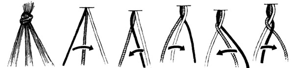 Из грубых волокон, которые не обрабатывались чесанием, вьются веревки и канаты. Волокна сначала лучше всего скручивать или сплетать в тонкие жгуты, которые затем сплетаются в более толстую веревку (рисунок 2.8). При сращивании отдельных жгутов необходимо чтобы места сращивания были разнесены по длине. При скручивании три отдельных жгута закручиваются друг за друга по часовой стрелке как можно туже, а концы завязываются «восьмеркой» (таблица 2.1 (1)).
