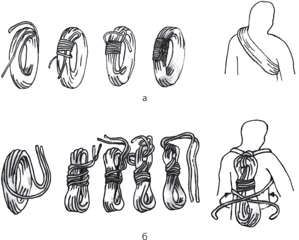Чтобы веревка не запутывалась, хранить и переносить ее лучше свернутой в бухту (рисунок 2.9 а) или моток (рисунок 2.9 б).