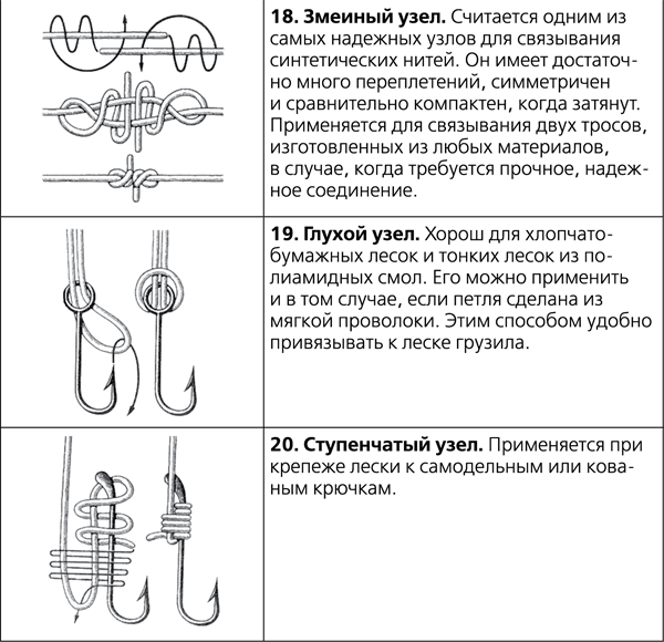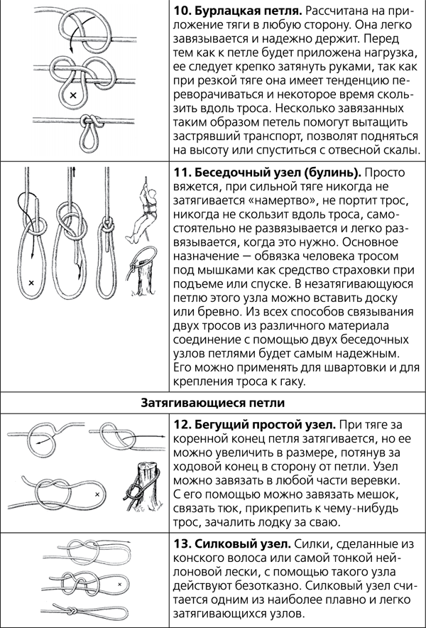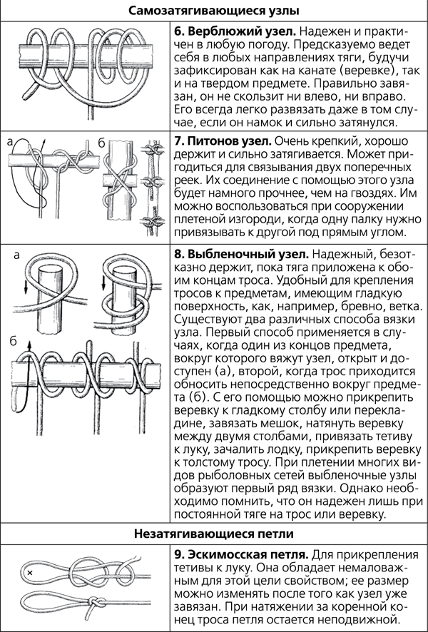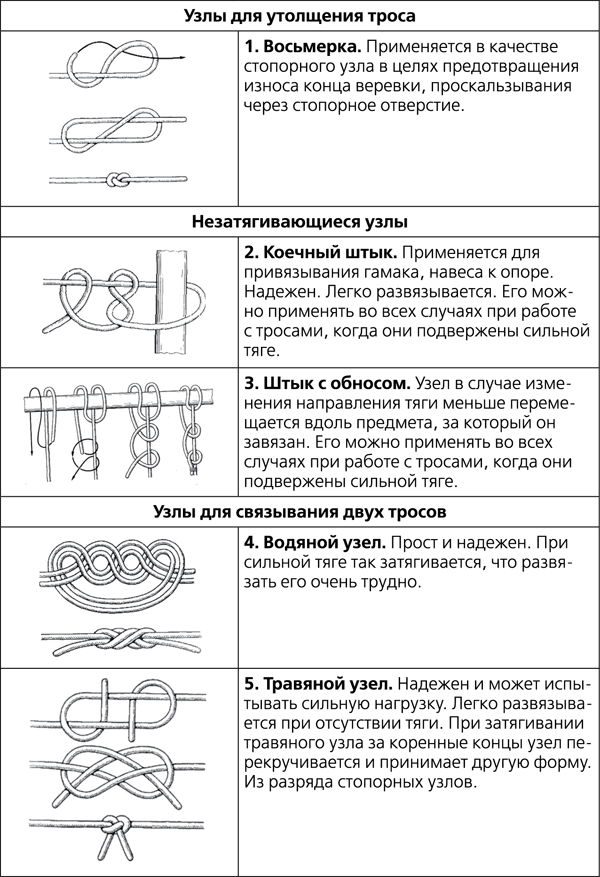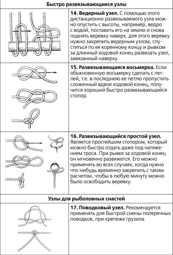 Вязка узлов. При вязке узлов не следует забывать на концах связанных веревок делать дополнительные страховочные узлы. Саморазвязывающиеся узлы вяжутся с дополнительной петелькой в узле одного из концов веревки или с палочкой, предварительно вставленной в узел.
