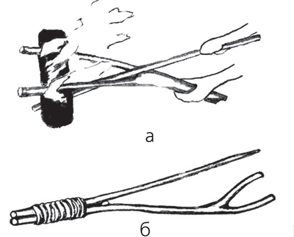 Ухват. Связываются вместе две ветки так, чтобы их концы расходились. Для этого в месте скрепления веток вставляется клин. Захват такого ухвата будет крепче, если одна из веток имеет на конце развилку (рисунок 2.10 б). Используется для перемещения горячих предметов.