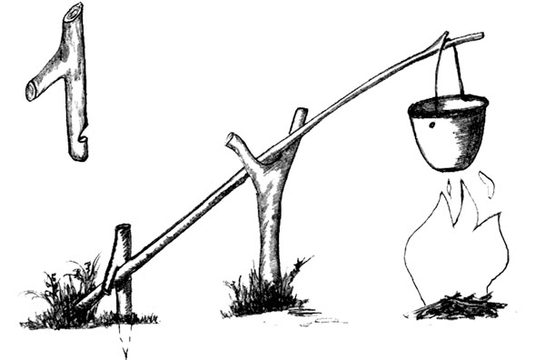 Кронштейн «удочка». В землю рядом с костром вбивается крепкий кол-опора с развилкой на конце. На него ложится длинная палка так, чтобы один ее конец находился над костром. Нижний конец палки втыкается в землю и придавливается камнями или вставляется во вбитый в землю кол с обратной развилкой. На конце палки, расположенной над костром, делается вырез, который не позволит емкости или деревянному крючку соскальзывать (рисунок 2.11).