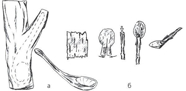 Ложку можно вырезать из подходящего куска дерева, в том месте, где от него отходит сучок, который используется в качестве ручки (рисунок 2.12 а). Быстро ложка делается из куска бересты и палки (рисунок 2.12 б).