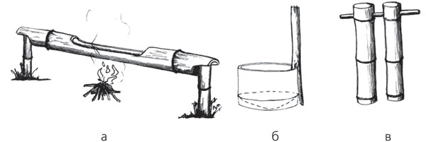 Посуда для варки. При отсутствии посуды для варки пищи можно использовать половину зеленого кокосового ореха или ствол бамбука (рисунок 2.14 а). Для этой цели выбирается бамбуковое колено диаметром 80–100 мм, в верхнем (открытом) конце прорезаются два сквозных отверстия, а затем внутрь вставляется лист банана, свернутый так, чтобы блестящая сторона была снаружи. Чтобы древесина не прогорала, время от времени необходимо менять положение бамбука. При кипячении воды банановый лист не вставляется.