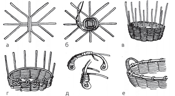 Плетение начинается с крестовины. Для получения дна круглой формы вырезаются 6 прутьев длиной в 1,5 раза больше предположительной высоты емкости и диаметром 5 и 4,5 мм. Они уплотняются в срединной части и слегка остругиваются ножом (рисунок 2.15 а).