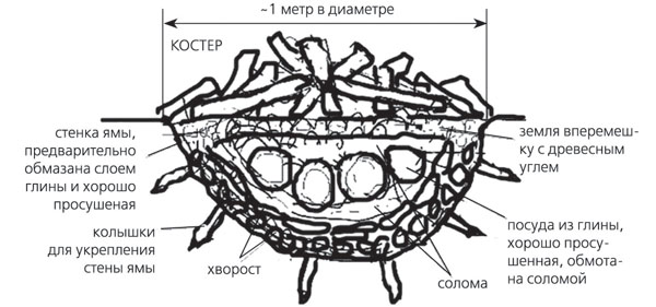 Изготовить посуду необходимой формы и размера, сложить ее в яму (рисунок 2.16), зажечь костер: примерно через 2–3 часа костер начинает проседать, постоянно подкладывать дрова, жар должен уходить в яму. Держать костер еще пару-тройку часов и оставить остывать до утра.