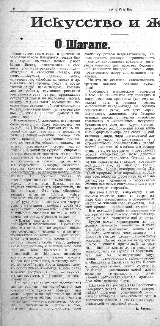 Ил. 7. Статья Аркина «О Шагале» в журнале «Экран. Вестник театра – искусства – кино – спорта». 1921. № 7. С. 8