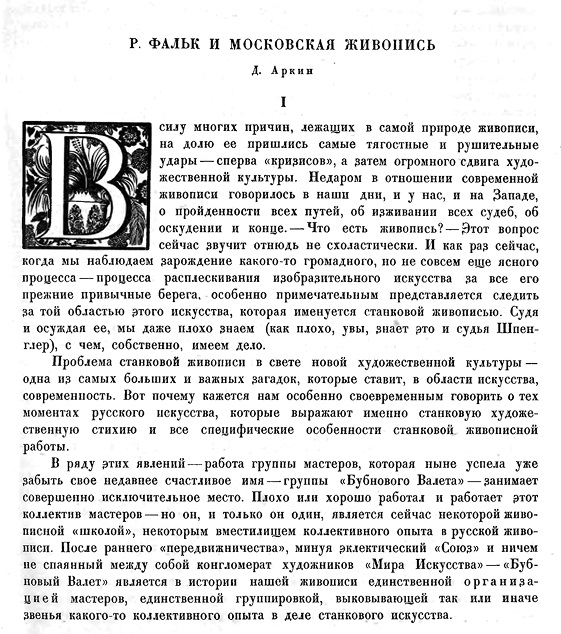 Другое дело, что большинство статей о художниках были небольшими заметками или, по определению самого А. Ветрова, «случайными набросками»78. На этом фоне выделяется большой текст о Фальке, пожалуй, самая искусствоведческая (и в этом смысле самая нехарактерная для того времени) статья Аркина о живописи: он пишет о живописности, цвете, свете, объеме. Но здесь, как и в других статьях об изобразительном искусстве, слышны отголоски «производственнической» риторики Аркина. Говоря об эволюции в живописи – от «бессюжетности» к «математически-чистой живописности супрематизма», – Аркин подчеркивает, что финалом этого процесса должно стать или «самоубийство живописи», или ее «прыжок <…> в круг художественного производства»79. (Почти так же Аркин писал и про Шагала: «Шагал, танцующий с живописью поистине танец ее смерти»80.) Фальк, по Аркину, – полная противоположность «производственному» Татлину: Татлин – «экспериментатор», его деятельность – «лаборатория»81, а про Фалька: «[среди художников «Бубнового валета»] никто не является в такой малой степени экспериментатором»; «лаборатория Фалька заканчивает, а не начинает, выявляет, а не пробует»82.