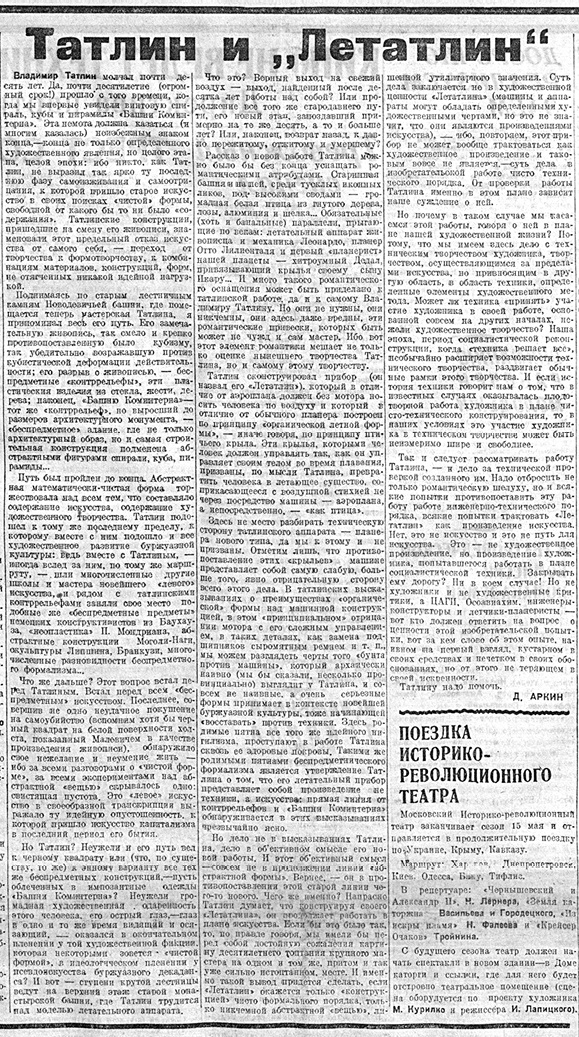 Ил. 14. Статья Аркина «Татлин и „Летатлин“» в газете «Советское искусство». 1932. № 17. 9 апреля. С. 3