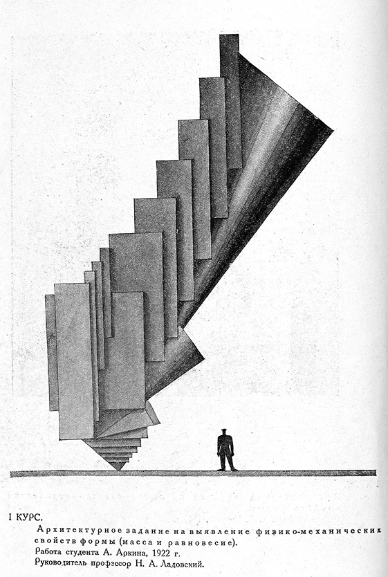 Ил. 15. Аркадий Аркин. Архитектурное задание на выявление физико-механических свойств формы (масса и равновесие). 1922. Руководитель: профессор Н. А. Ладовский. Иллюстрация из кн.: Архитектура. Работы архитектурного факультета Вхутемаса. 1920–1927. М.: Издание Вхутемаса, 1927. С. 2