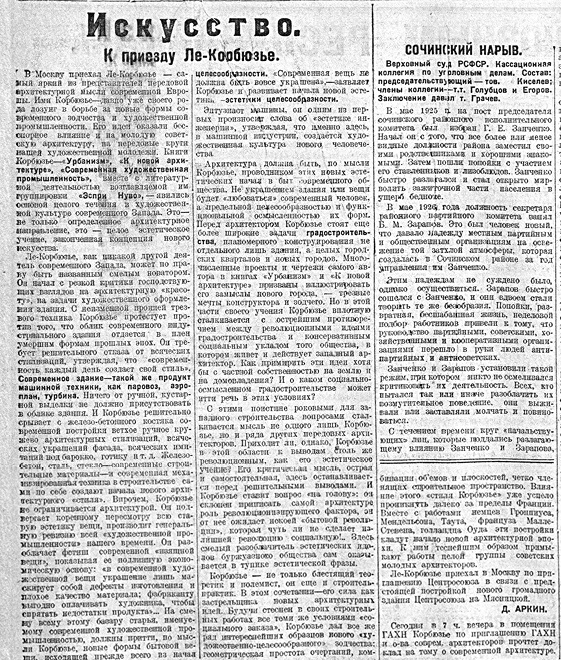 В Москву приехал Ле Корбюзье – самый яркий из представителей передовой архитектурной мысли современной Европы. Имя Корбюзье – давно уже своего рода лозунг в борьбе за новые формы современного зодчества и художественной промышленности. Его идеи оказали бесспорное влияние и на молодую советскую архитектуру <…>.