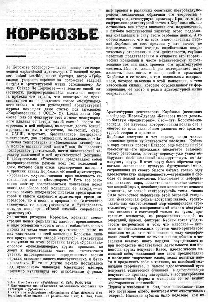 В лице Корбюзье перед нами на редкость законченное сочетание главы и теоретика определенной школы, насчитывающей немало адептов во всем мире (не исключая и СССР), выдающегося архитектора-практика и, наконец, деятеля других искусств, именно живописи и художественной промышленности. <…> Говоря о Корбюзье, о его архитектурной концепции, мы в то же время говорим о достаточно обширном круге явлений, занимающих виднейшее место в архитектурном развитии новейшего времени110.