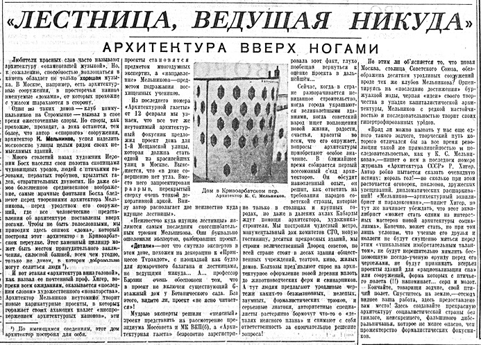 Спустя пять дней, 18 февраля, в «Комсомольской правде» была опубликована анонимная статья «„Лестница, ведущая никуда“. Архитектура вверх ногами», посвященная Мельникову. Поводом послужил напечатанный в «Архитектурной газете» проект дома на 1‐й Мещанской улице, но досталось и клубу на Стромынке и собственному дому архитектора в Кривоарбатском переулке: «Этот каменный цилиндр может быть местом принудительного заключения, силосной башней, всем чем угодно, только не домом, в котором добровольно могут селиться люди», – писал автор. Мельников был назван «архитектурным фокусником», его проекты – «карикатурными» и «уродливыми»: даже «самые мрачные фантазии Босха бледнеют перед творениями архитектора Мельникова, перед уродством его сооружений, где все человеческие представления об архитектуре поставлены вверх ногами. <…> [Москва] обезображена десятком уродливых сооружений вроде тех же кубов Мельникова <…> Мельников с редкой настойчивостью и последовательностью творит своих гипертрофированных уродов» и т. д. и т. п.154
