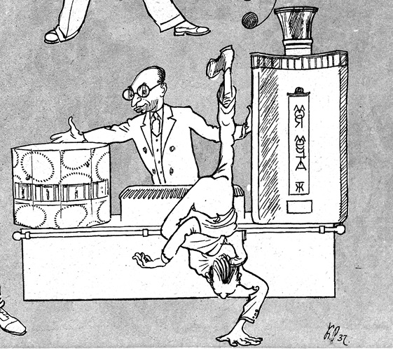 Ил. 22. Константин Ротов. «…архитектор Мельников на себе лично пробует те методы, какими он пользовался в своих проектах (клуб имени Русакова, клуб завода «Каучук» и др.), т. е. стоит вверх ногами». Шарж из журнала «Крокодил». 1937. № 17. Июнь. С. 9. Фрагмент. За Мельниковым – М. Гинзбург с проектом комбината газеты «Известия»