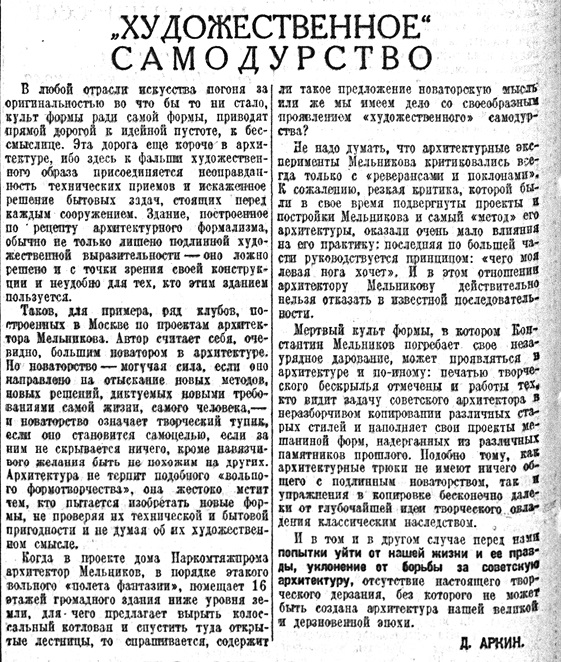 Аркин назвал свою заметку «„Художественное“ самодурство». Он также писал о «культе формы ради формы», о «вольном формотворчестве» и «полете фантазии» Мельникова. Но не только – Аркин расширил круг «уклонистов», включив в него и тех, кто неверно осваивает архитектурное наследие: