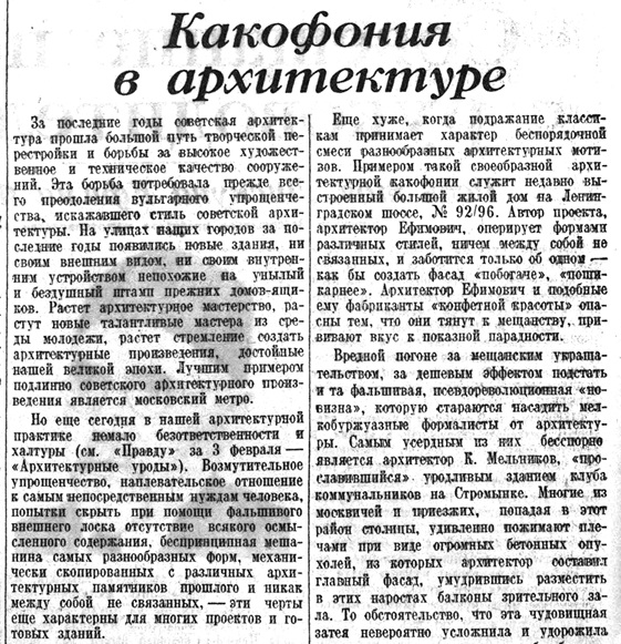 Мертвый культ формы, в котором Константин Мельников погребает свое незаурядное дарование, может проявляться в архитектуре и по-иному: печатью творческого бескрылья отмечены и работы тех, кто видит задачу советского архитектора в неразборчивом копировании различных старых стилей и наполняет свои проекты мешаниной форм, надерганных из различных памятников прошлого. Подобно тому, как архитектурные трюки [Мельникова] не имеют ничего общего с подлинным новаторством, так и упражнения в копировке бесконечно далеки от глубочайшей идеи творческого овладения классическим наследием. И в том, и в другом случае перед нами попытки уйти от нашей жизни и ее правды, уклонение от борьбы за советскую архитектуру157.