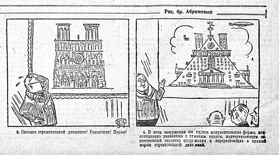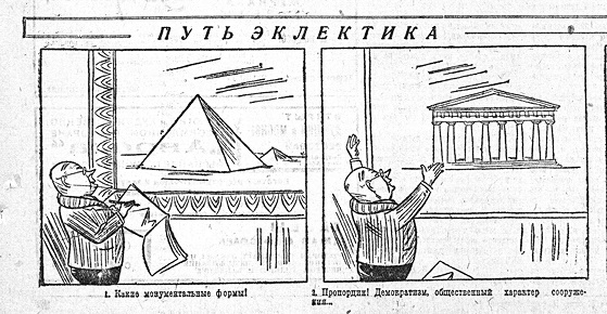 (Отмечу в скобках, что формулировки Аркина – «мешанина форм, надерганных из различных памятников прошлого» и «какофония» – станут своего рода иконографической программой для огромного числа карикатур на архитекторов-эклектиков, появившихся в середине 1930‐х, и не только в профессиональной прессе, в частности, в «Архитектурной газете», но и в журнале «Крокодил», один из номеров которого, вышедший накануне 1‐го съезда архитекторов в 1937 году, был целиком посвящен архитектуре159.)