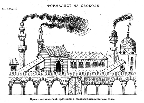 Ил. 26. Николай Радлов. «Формалист на свободе. Проект механической прачечной в славянско-мавританском стиле». Шарж в журнале «Крокодил». 1937. № 15. Май. С. 5