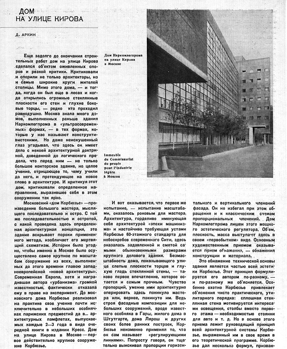 Это, пожалуй, самая неприятная статья во всей библиографии Аркина. И тон ее гораздо более жесткий, чем в «Комсомолке». Обозрев различные архитектурные премьеры Москвы, он обвинил в «безответственности и халтуре», в «упрощенчестве», в «попытке скрыть при помощи фальшивого внешнего лоска отсутствие всякого осмысленного содержания», в «беспринципной мешанине самых разнообразных форм» практически все направления советской архитектуры. Под каток Аркина попали и конструктивистский дом «Политкаторжан» Д. П. Знаменского и Н. В. Ликина, ставший «следствием левацкой установки на искусственное насаждение бытовых коммун», и классические дом Наркомлеса А. К. Бурова, чей фасад «„украшен“… напыщенными, фальшивыми архитектурными атрибутами», и дом «Автодорожник» Б. В. Ефимовича – «пример архитектурной какофонии», «конфетной красоты» и «мещанского украшательства». Естественно, Аркин упоминает и «мелкобуржуазного формалиста от архитектуры» и «эпигона западно-европейского конструктивизма» Мельникова с его «уродливым зданием» Клуба коммунальников и «беспринципным формотворчеством» в проекте Наркомтяжпрома, и Ле Корбюзье, чей дом Наркомлегпрома выглядит как «странное нагромождение бетона, железа и стекла». «В архитектуре, – завершает Аркин, – особенно нужны максимальная бдительность и требовательность»158 (см. Приложение 10).