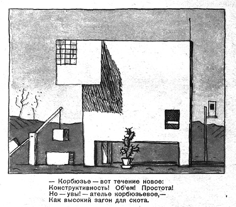 – Корбюзье – вот течение новое: Конструктивность! Объем! Простота! Но – увы! – ателье корбюзьевое, — Как высокий загон для скота.