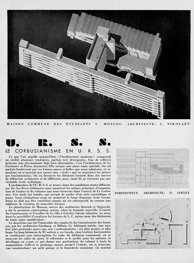 В дальнейшем журнал публиковал материалы об архитектурных новинках – Доме Наркомфина, Доме Советов в Нижнем Новгороде, Днепрогэсе и др. А в ноябре 1931 года советская архитектура стала главной темой журнала. Здесь были напечатаны сразу пять статей «Проблема строительства социалистических городов в СССР» А. Л. Пастернака, «Архитектура рабочих клубов в СССР» и «Дворец Советов в Москве» Ильина, «Урбанизм в СССР» Пьера Бурдекса, а также неподписанная (возможно, тоже Ильина) «Современная архитектура и проблема жилища в СССР»185. Публикация сопровождалась множеством фотографий и проектов, благодаря чему французский читатель мог получить достаточно полное представление о состоянии современной советской архитектуры накануне конгресса CIAM.