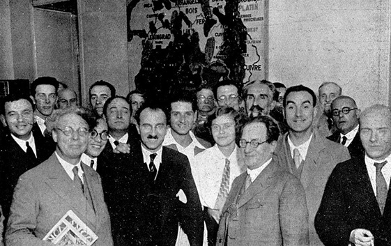 Ил. 31. Делегация журнала L’Architecture d’aujourd’hui в Москве. 1932. Крайний слева – Аркин, перед ним с журналом «Бюллетень ВОКСа» – Альфред Агаш, в центре Андре Блок (в черном костюме), за ним Пьер Ваго (воротник рубашки поверх пиджака). Фотография из журнала L’Architecture d’aujourd’hui. 1932. № VIII. Novembre. P. 94