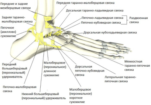 Большеберцовая и малоберцовая кости. Первая контактирует через вогнутую поверхность на верхней стороне дополнительного цилиндра таранной кости и через его продолжение, лодыжку большеберцовой кости, с дополнительной стороной таранной кости, расположенной внутри. Вторая, напротив, через малоберцовую лодыжку контактирует с латеральной суставной поверхностью таранной кости.